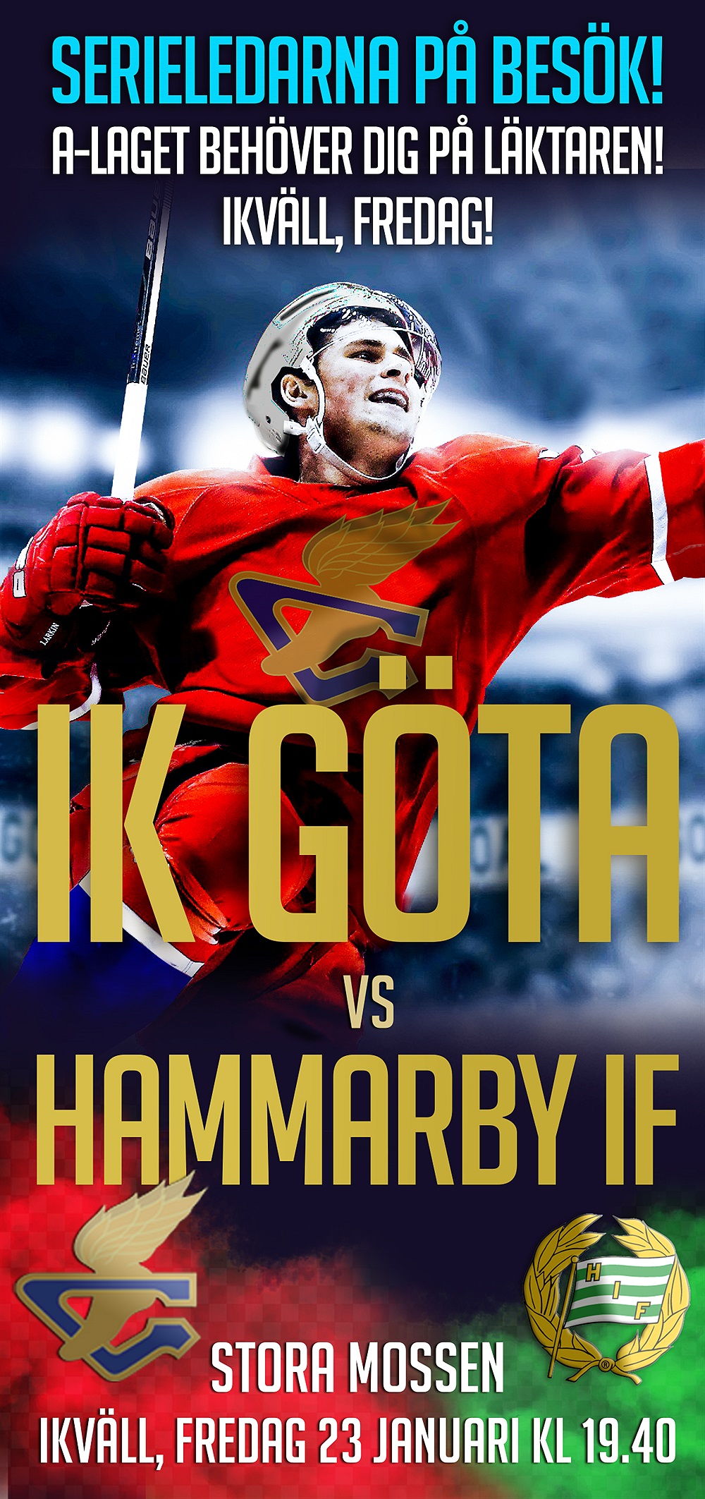 Hammarby leder serien. Vi för fyra poäng ifrån kvalserien till HockeyEttan. Din insats på läktaren gör skillnad! Kom och stötta A-laget ikväll kl 19.40 på Stora Mossen!